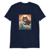 This ukiyo-e inspired art depicts various cats riding a large cresting wave in homage to Hokusai's iconic Great Wave off Kanagawa woodblock print.