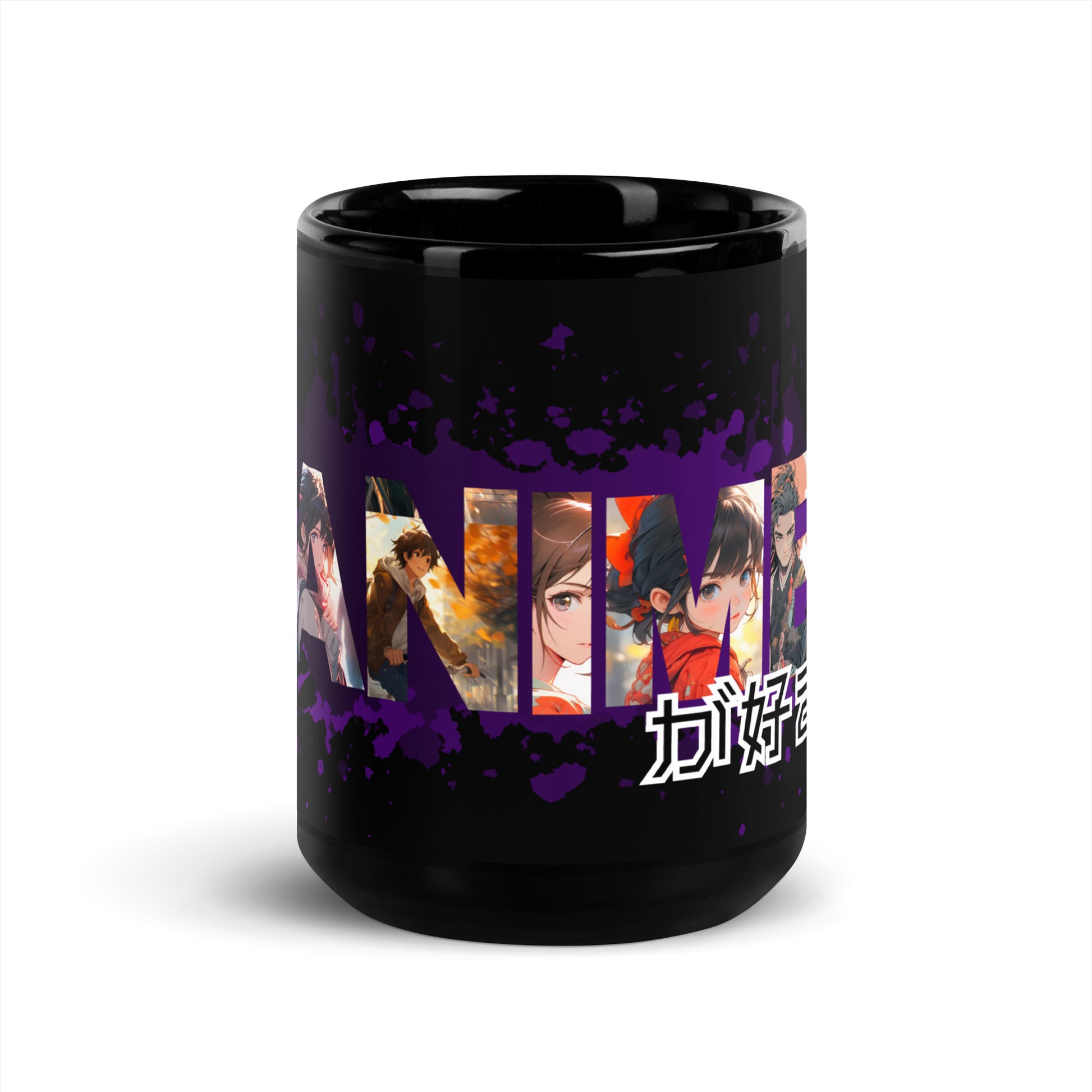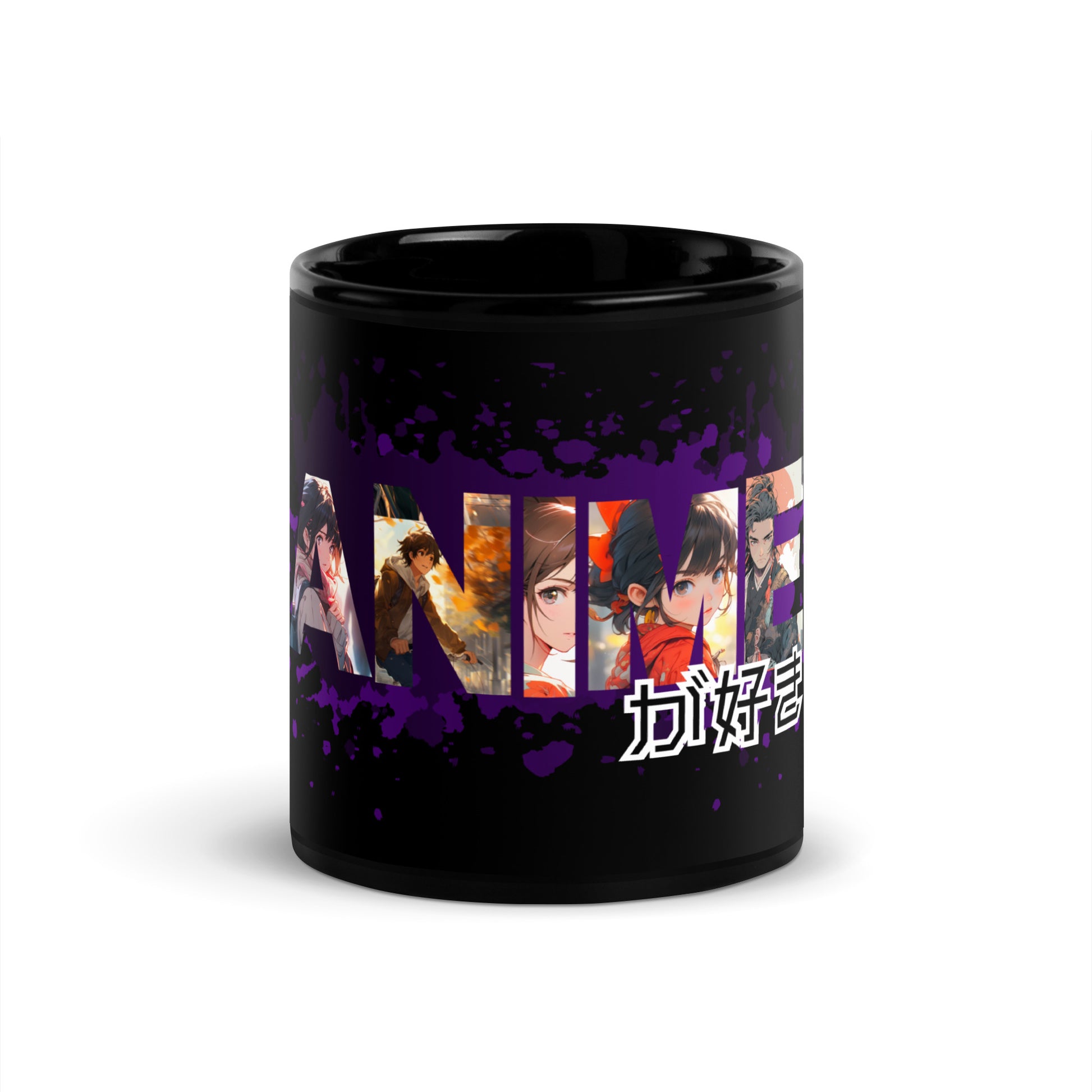 The word "Anime" is spelled out in bold letters filled with cute anime characters against a splash of purple paint, with Japanese text that translates to "I like Anime" for a fun, upbeat design celebrating anime fandom. The lively characters encapsulate the appeal and excitement of Japanese animation.