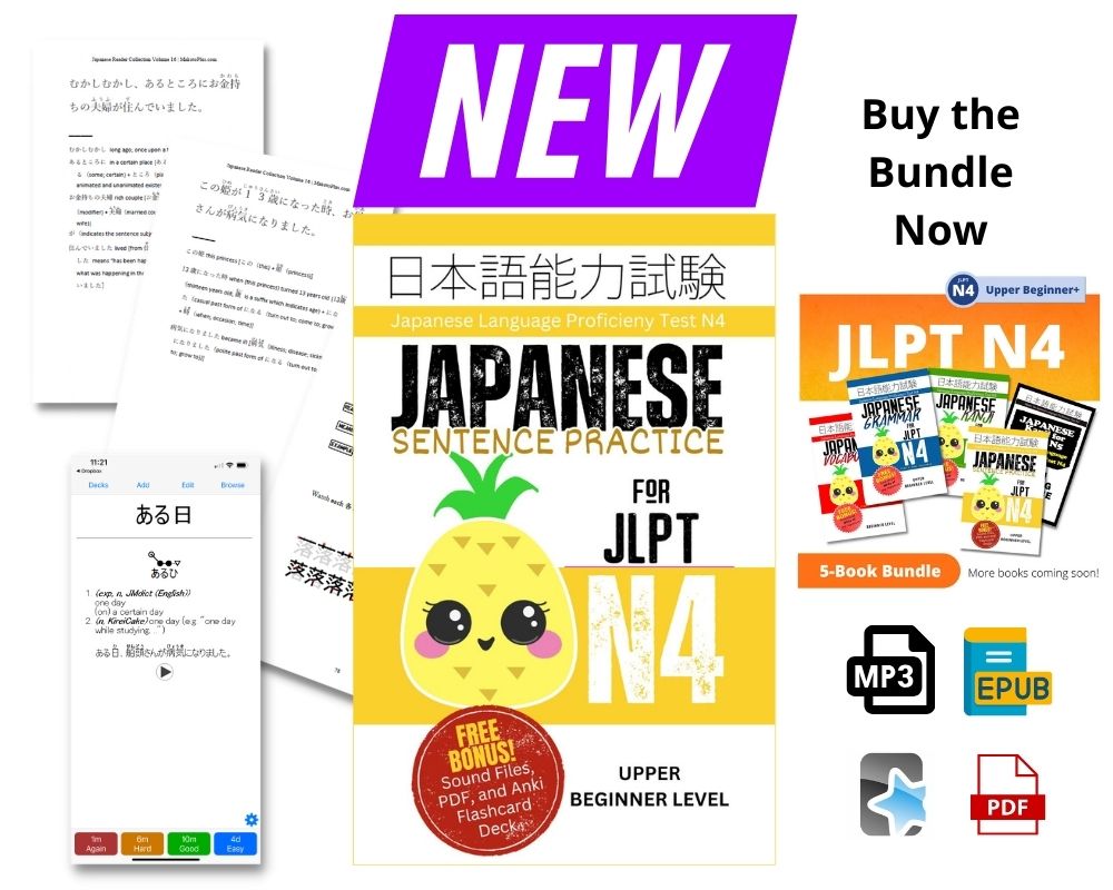 NOTE: Our 5-book JLPT N4 bundle is currently ON SALE, complete with FREE Lifetime Updates! This self-paced Japanese study guide is available for a limited time at a special discounted price. As we add more content, the price will increase. However, if you purchase it now, all future updates will be yours FREE FOREVER.