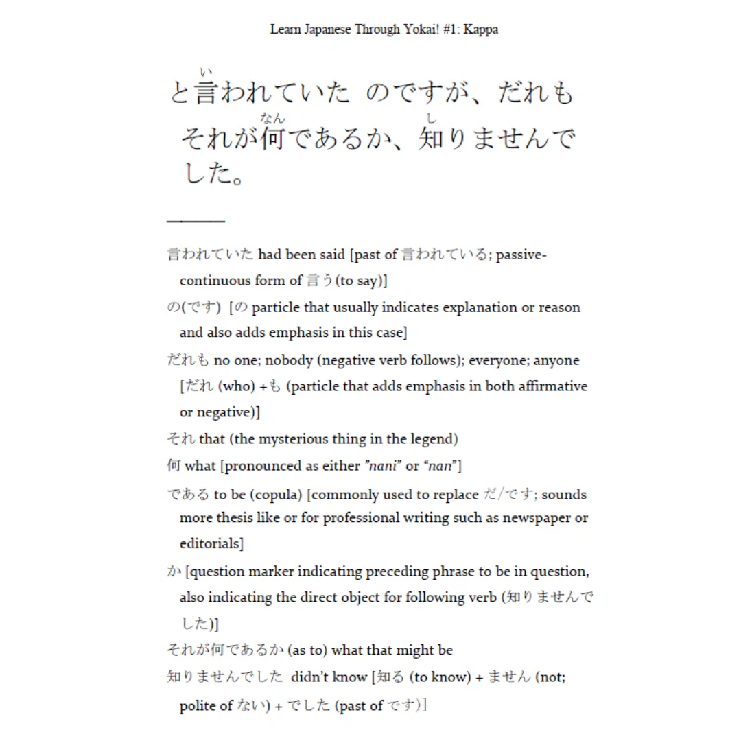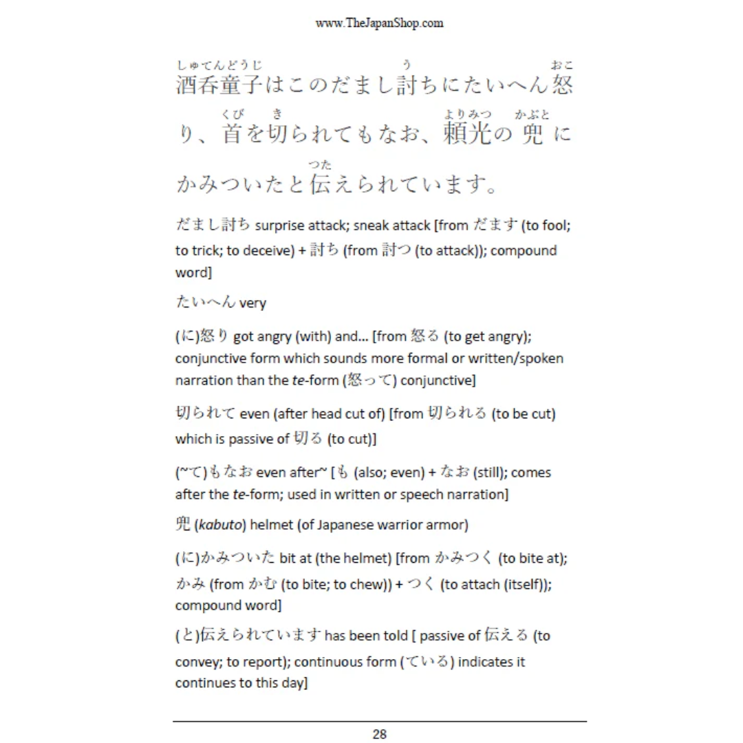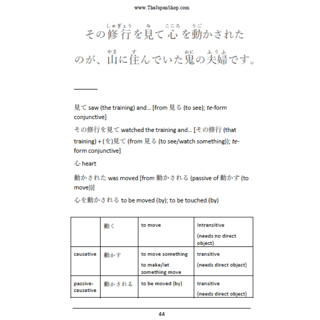 Great for beginners as well as more advanced users looking to review! I like that there isn’t an initial “direct translation” of the entire story, but rather kanji meanings, combinational readings, and phrasal explanations! It really makes your brain work to translate it before you go on to check your work!