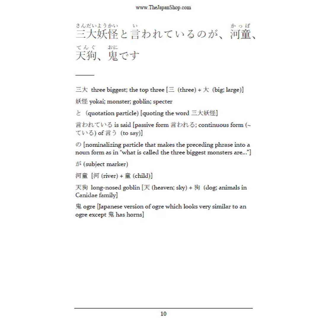 This model is very interesting for people like me who like the story of yokai. It's still challening for me, but the bundle is good for training reading in japanese and to expand the vocabulary! The explanation in the same page helps to learn in a dynamic process, and I don't have to stop the story to search the kanji and meaning, losing the momentum of the narrative.